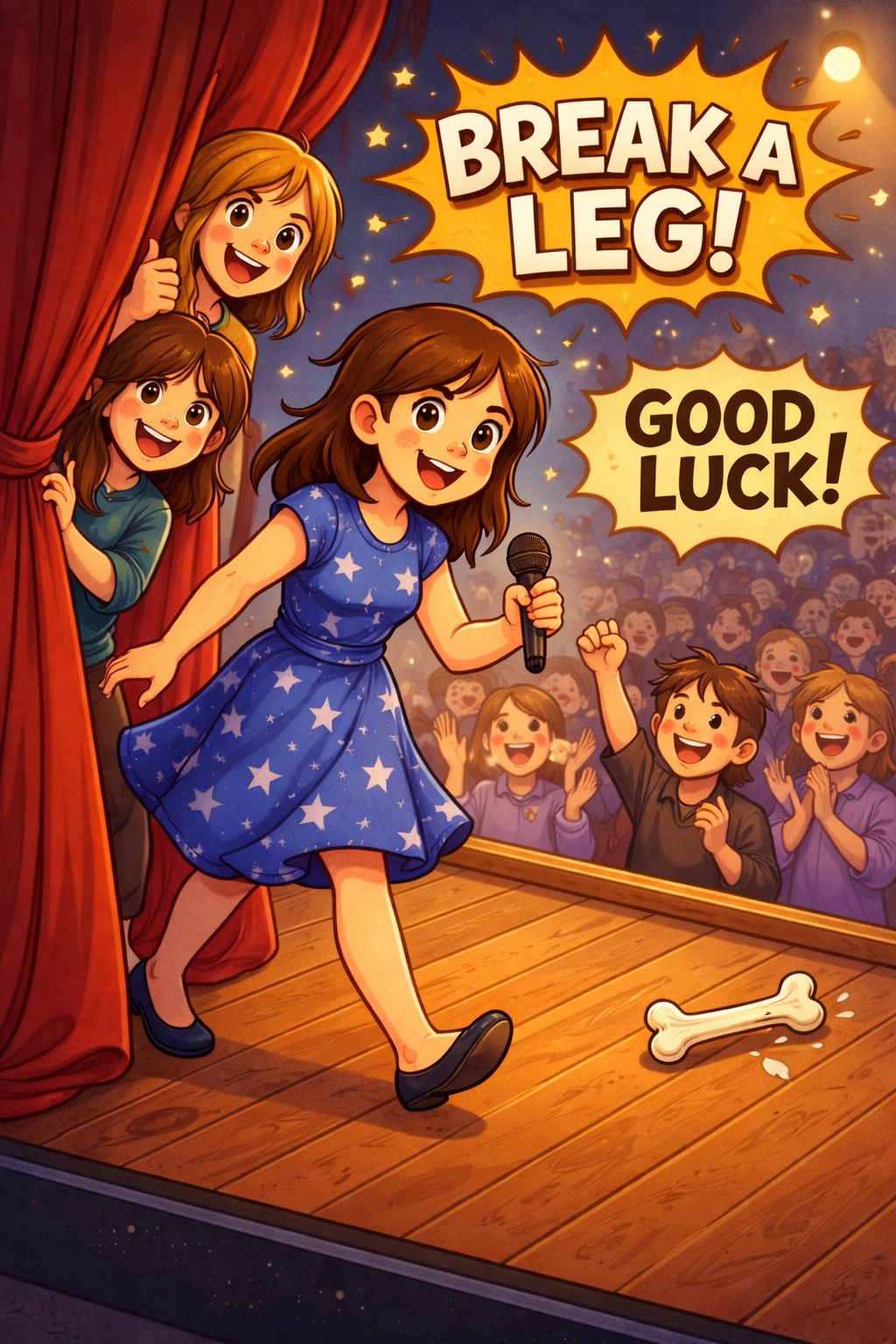 そのうえで、Break a leg. を知っておくと、「学校ではあまり習わないけれど、おもしろい英語表現」として印象に残ると思います。